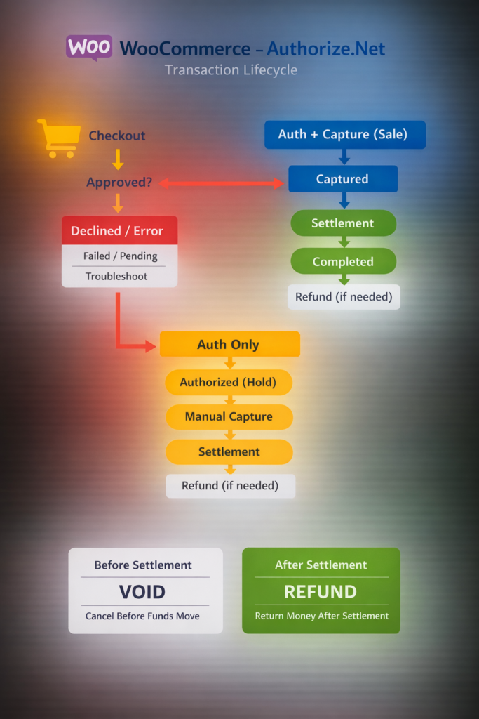 Transaction Lifecycle in WooCommerce + Authorize.Net (Auth, Capture, Settlement, Void, Refund)